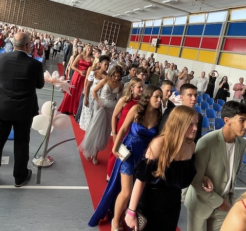 In diesem Jahr fand unsere Abschlussfeier am Freitag, 14.7.23 wieder in unserer Schule statt. Glücklicherweise besitzt unsere alte Turnhalle, in der der erste Teil der Feier stattfand, seit kurzer Zeit die lang ersehnten zwei neuen Notausgänge, so dass das unmenschliche Schwitzen der letzten Jahre der Vergangenheit angehört und wir zudem deutlich mehr Personen einladen dürfen.