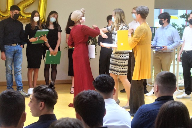 Mehrere Klassensprecherinnen und -sprecher richteten das Wort an ihre Mitschülerinnen und Mitschüler. Ann-Kathrin Benz meinte, es sei für alle in der Zukunft wichtig, dass „man so sein kann, wie man wirklich ist.“ Der Dank aller galt den Eltern und den Lehrkräften, die die Jugendlichen durch die vergangenen Schuljahre mit all ihren Höhen und Tiefen geleitet hatten. Mit zwei Einzeldarbietungen lockerten Ann-Kathrin Vögler (Tanz) und Nils Allmann (Rap-Song) die ansonsten wegen der Corona-Situation sehr kurz gehaltene Feierstunde auf.