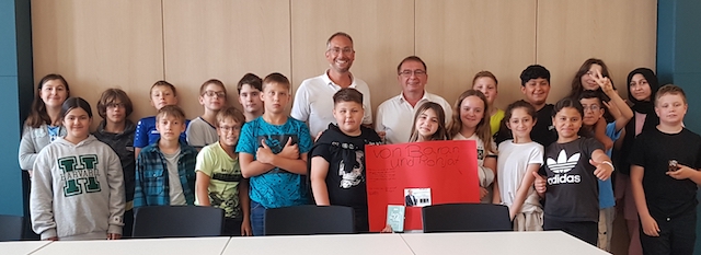 Die F5a mit Klassenlehrer Herrn Schiener verabschiedete sich stellvertretend für die gesamte Schulgemeinde der ASS beim langjährigen Bürgermeister Achim Grimm. Die Zusammenarbeit war von großem Vertrauen und gegenseitiger Anerkennung geprägt, das Wohlergehen der Schule ist ihm sehr wichtig. In seiner langen Amtszeit war Bürgermeister Grimm ein großer Unterstützer der Schule, man denke zum Beispiel nur an die zahlreichen Veranstaltungen der ASS, die von der Gemeinde Groß-Zimmern gefördert wurden, seien es Klassenfahrten oder auch Auftritte der Schulband oder des Trommeldonners. Die ASS dankt Herrn Grimm von ganzem Herzen. Herr Schiener durfte zu diesem Anlass die Ehrennadel der Schule überreichen.