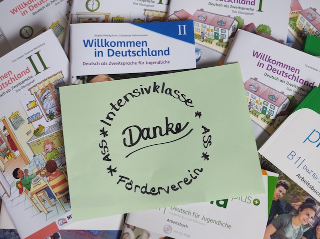 Unsere Schülerinnen und Schüler der Intensivklasse und ihre Klassenlehrerin Frau Heinemann freuen sich sehr über neue DaZ-Arbeitsbücher und ihre ASS Kompass-Hefte. Wir wünschen allen einen guten Start ins neue Schuljahr. Vielen herzlichen Dank an den Förderverein der ASS!
