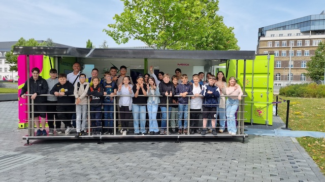Am 20.06.24 haben wir, die Klassen F5a und F6a, einen Ausflug zum „Curiosity Cube“ der Firma Merck unternommen. Mit Bus und Straßenbahn ging es zum Merck-Firmengelände nach Darmstadt. Vor Ort haben wir uns mit dem Thema Nachhaltigkeit am Beispiel des Lebenszyklus von T-Shirts beschäftigt.