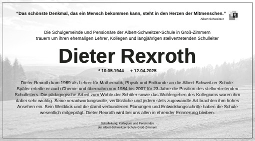 Dieter Rexroth hat in seiner mehr als 20 Jahre andauernden Tätigkeit als stellvertretender Direktor die Albert-Schweitzer-Schule maßgeblich mitgeprägt. Wir trauern um einen langjährigen Weggefährten.