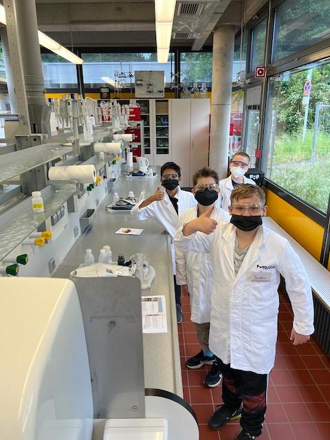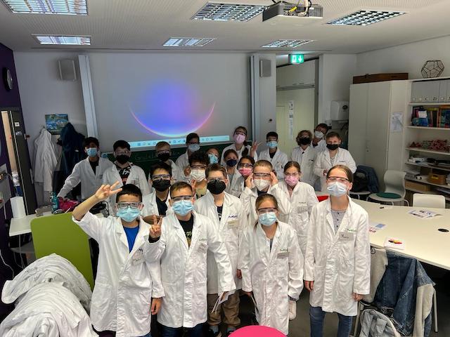 Eine kleine Nachschau: Am 24.05.2022 begab sich die G5c (heute G6c) auf eine spannende Fahrt in das Juniorlabor der Darmstädter Weltfirma Merck. Der Tag drehte sich rund um das Thema Farben. Die Kinder schlüpften in die weißen Arbeitskittel und färbten beispielsweise Seidentücher mit zwei verschiedenen Methoden ein. Zum einen erfuhren sie durch eigenes Schaffen, wie man mit Indigo färbt. Zum anderen galt es, die Seidentücher mit Pflanzenfarbstoffen zu färben. Die schließlich noch anstehende Papierchromatograhie von Farbstiften ließ sich vor Ort aus zeitlichen Gründen zwar nicht mehr verwirklichen, wurde jedoch von Herrn Niemyth, dem Klassenlehrer der G5c, an der Schule nachgeholt. Es hat den Schülerinne und Schülern der Klasse sichtbar Spaß gemacht. Wer mehr über das Juniorlabor der Firma Merck erfahren möchte, klickt hier.