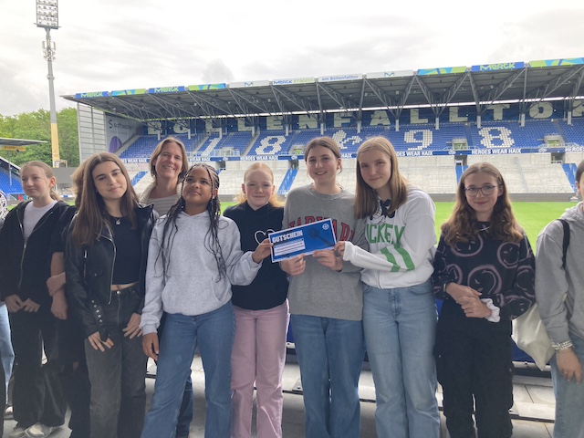 Eine besondere Veranstaltung stand am 7.5.24 für die G7a auf dem Programm, hatte sie doch einen der begehrten Teilnahmeplätze an den Röhm Umwelttagen ergattert, die das Traditionsunternehmen, dessen Marke Plexiglas allseits bekannt ist, in Kooperation mit dem SV Darmstadt 98 am Stadion Böllenfalltor veranstaltet. An drei Stationen konnten die Schülerinnen und Schüler aus drei Schulen der Region ihr Wissen um Mülltrennung, Plastikmaterialien und ihre Eigenschaften sowie deren Einsatz im Alltag – immer auch unter dem Aspekt des Umweltschutzes – einbringen und mehren. Dem Gewinner winkte eine Eintrittskarte für die gesamte Klasse zu einem Zweitligaheimspiel in der kommenden Saison. Und damit nicht genug, nach getaner Arbeit gab es eine Stadionführung, alle Teilnehmer konnten auf den Stühlen der Trainer und der Mannschaft am Spielfeldrand Platz nehmen, sich in den Spielerkabinen umschauen und auch die Bequemlichkeiten einer VIP-Lounge in Augenschein nehmen. Ein besonderer Spaß bestand darin, im offiziellen PR-Raum am Originalplatz des Trainers Torsten Lieberknecht dessen Position einzunehmen und sich den Fragen des fachkundigen Publikums aus der eigenen Klasse zu stellen. Der Gewinn des Klassenfußballtickets für ein Spiel der kommenden Saison machte den Besuch für die G7a perfekt.