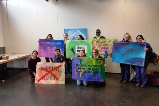 Am 01.03. fand im Jugendzentrum unser lange vorbereitetes Graffiti-Projekt statt. Von 13-17 Uhr haben wir unter professioneller Anleitung des Kommunikationsdesigners Jörn Heilmann und seines Mitarbeiters verschiedene Spray-Techniken ausprobieren dürfen und letztendlich alle unsere gesammelten Ideen verwirklichen können.