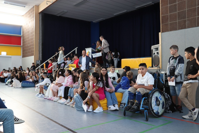 Sicher waren etliche Kinder aufgeregt, fängt für sie mit dem Start an der Albert-Schweitzer-Schule Groß-Zimmern doch ein neuer Lebensabschnitt an, ein weiterer Schritt hin zu mehr Selbständigkeit. Wie wird es werden an der neuen Schule, sind meine Freunde auch in der Klasse und finde ich neue Freunde? Wie sind meine Mitschüler und natürlich auch meine neuen Lehrkräfte? Fast alles, so rief der kommissarische Schulleiter Herr Bobitka den Kindern zu, ist neu für die jungen Menschen, und gleichzeitig machte er den Jüngsten Mut: Alle Mitglieder der Schulgemeinschaft freuen sich auf die „Neuen“, und sie werden hilfreich für sie da sein, seien es zum Beispiel die Patenschüler, seien es die Mitglieder der Schulleitung oder die Lehrkräfte an der ASS. Deshalb gilt: mutig und zuversichtlich sein, keine Angst vor Fehlern haben, offen und aufgeschlossen sein! Dann kann gar nichts schiefgehen. Die musikalische Begrüßung gelang duch den Trommeldonner und einen Chor aller Kinder der 6. Klassen, die zwei Willkommenslieder sangen. Und als die Klassenlehrkräfte des fünften Jahrgangs und Frau Heinemann für die IK-Klassen schließlich ihre neuen Schülerinnen und Schüler nach vorne baten, legte sich die Anspannung schnell und die Elternschaft schaute in viele glückliche Gesichter. Jedes Kind erhielt aus den Händen des Vorsitzenden des Fördervereins der ASS, Herrn Satorius, sein Exemplar des „Kompass“. Herzlichen Dank für die tolle Arbeit des Fördervereins, der an unserer Schule vieles möglich macht. Anschließend ging es zum Klassenfoto und dann mit den Lehrkräften und auch Eltern in die neue Klasse. Die ASS freut sich auf mehr als 110 neue Mitglieder der ASS-Schulgemeinschaft und wünscht allen Kindern einen guten Start an der neuen Schule.