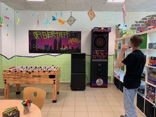 Bereits seit vielen Jahren steht der Offene Treff der ASS verlässlich an der Seite der zu betreuenden Kinder. Täglich montags bis freitags von 12:15 bis 15:30 bietet die Nachmittagsbetreuung der ASS allen Schülerinnen und Schülern ihre Dienste an. Ein Schwerpunkt liegt dabei erwartungsgemäß auf der Betreuung von Kindern der Jahrgänge 5 und 6, eine vorherige Anmeldung ist nicht erforderlich. Zwei, zuweilen auch drei Mitarbeiterinnen kümmern sich im Treff selbst, aber auch im Außenbereich der Schule intensiv um die Belange der Kinder. Neben Karten- , Brett- und weiteren Spielen stehen als besondere Highlights ein stabiler Tischkicker und das ebenso beliebte elektronische Dartsspiel zur Verfügung. Täglich hört man nachmittags das Klacken der Tischtennisbälle. Kreativität durch Basteln nimmt einen hohen Stellenwert ein: Zu allen denkbaren Anlässen basteln die Heranwachsenden schöne kleine Kunstobjekte, seien sie als Geschenk für die Mama zum Muttertag gedacht, als Osterschmuck oder als liebevolle Accessoires fürs Bad, etwa in Form selbst gemachter Seifen. Der Kreativität sind keine Grenzen gesetzt.