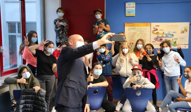 Mit viel Vorfreude erwarteten die Schülerinnen und Schüler der F5a ihren Besucher Manfred Pentz, heute Abgeordneter des Hessischen Landtags, früher selbst – wie sie jetzt –  Mitglied der ASS-Schulgemeinde. Routiniert und mit Pep präsentierten unsere Jüngsten auch unter den Augen von Direktor Wollenhaupt ihren Rap „Mit Abstand“, den sie in Zeiten des Distanzunterrichts unter der Leitung ihres Musiklehrers Andreas Schiener zusammen mit den Parallelklassen F5b und F5c geschrieben und vertont hatten. Herr Pentz, sehr angetan von der Darbietung und voll des Lobes für die engagierte Arbeit der Kinder und ihres Lehrers, ließ es sich nicht nehmen, ein Selfie mit den jungen Musikern zu schießen, um anschließend von ihnen und Herrn Schiener zu erfahren, wie es gelingen konnte, trotz der schwierigen Umstände, dem leider notwendigen Abstand zueinander, mittels digitaler Technik einen so runden Rap-Song gemeinsam zu texten, zu singen und als Video zu produzieren. Und sie hatten ihrerseits viele Fragen an ihren Besucher, die Herr Pentz gerne beantwortete: Ob er musikalisch sei (ja), wer seine Lieblingslehrerin gewesen sei (Frau Tscherney, heute noch aktiv an der ASS), welche seine Lieblingsfächer waren (Deutsch, Englisch) und vieles mehr. Gerne hörte die VIP-Klasse (O-Ton Herr Pentz) auch, dass dieser sie zu einem Besuch des Hessischen Landtags einlud.