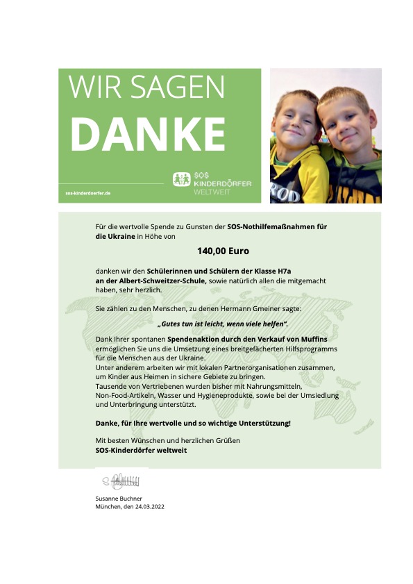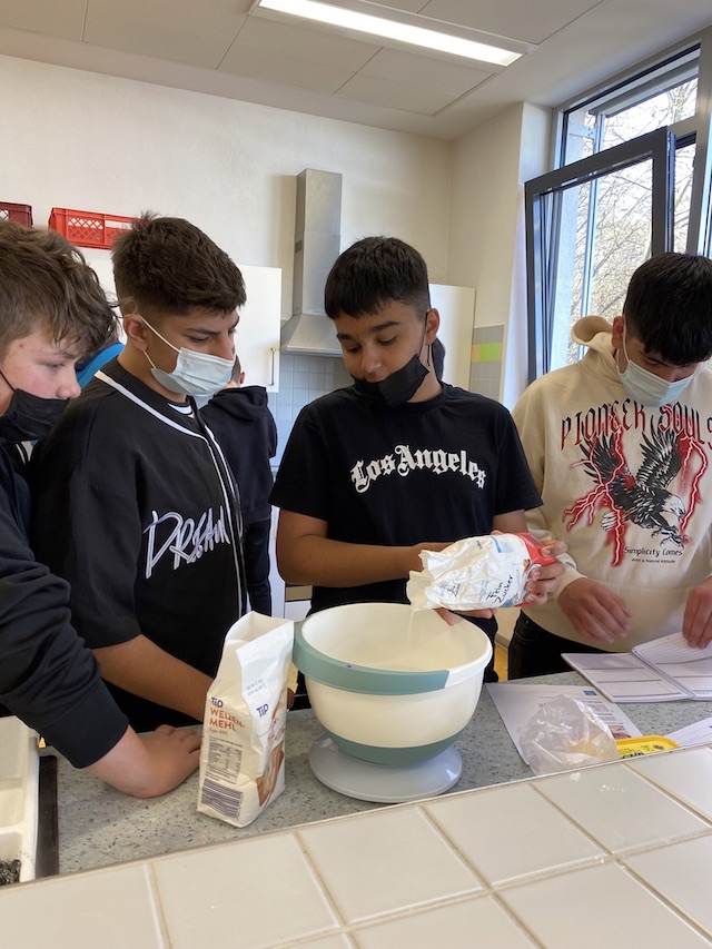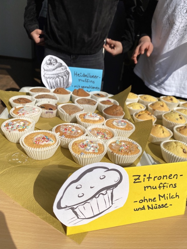 Wir Schüler der H7a hatten zusammen mit unserer Klassenlehrerin Frau Bühler die Idee, im AL-Unterricht bei Frau Assmann Muffins zu backen und sie dann für einen guten Zweck auf dem Pausenhof zu verkaufen. Damit für alle etwas dabei war, haben wir vier verschiedene Sorten angeboten: Zitrone, Schoko, Heidelbeer und ganz normale. 150 Muffins wurden an Ständen vor der Mensa und an den Tischtennisplatten begeistert gekauft, denn durch Corona waren solchen Aktionen lange Zeit nicht möglich.