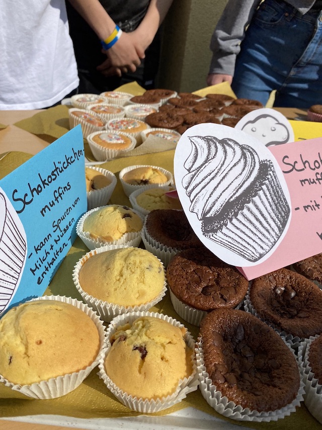 Wir Schüler der H7a hatten zusammen mit unserer Klassenlehrerin Frau Bühler die Idee, im AL-Unterricht bei Frau Assmann Muffins zu backen und sie dann für einen guten Zweck auf dem Pausenhof zu verkaufen. Damit für alle etwas dabei war, haben wir vier verschiedene Sorten angeboten: Zitrone, Schoko, Heidelbeer und ganz normale. 150 Muffins wurden an Ständen vor der Mensa und an den Tischtennisplatten begeistert gekauft, denn durch Corona waren solchen Aktionen lange Zeit nicht möglich.