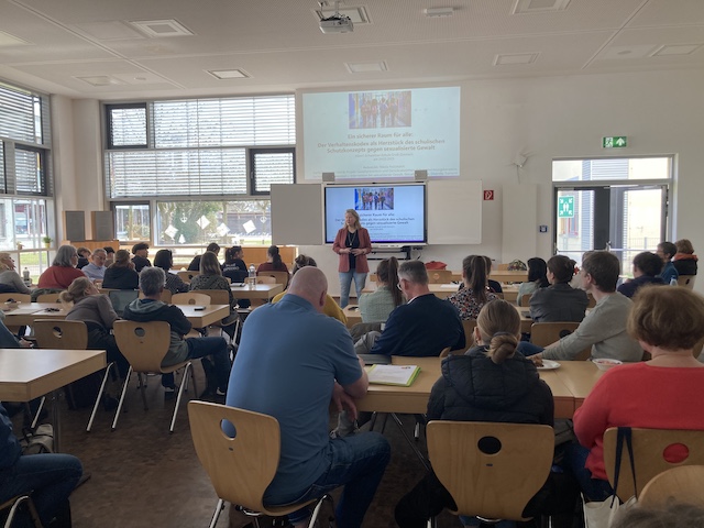 Die Teilnehmer des Pädagogischen Tages absolvierten zunächst das Basismodul „Was ist los mit Jaron“, den digitalen Grundkurs zum Schutz vor sexuellem Missbrauch, bereitgestellt von der unabhängigen Beauftragten für Fragen des sexuellen Kindermissbrauchs. Aufbauend auf die Ergebnisse dieses Kurses moderierte Frau Nicole Poitzmann, u.a. Schulentwicklungsberaterin im Rahmen der Hessischen Lehrkräfteakademie, die gemeinsame gruppenweise Erarbeitung eines Verhaltenskodex. Die reichlichen Ergebnisse fließen nun in die konkrete Formulierung ein.