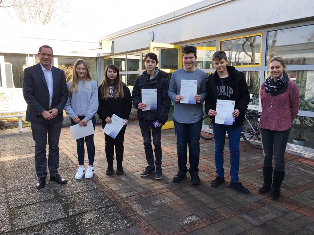Stolz präsentieren die Schulsiegerinnen und -sieger des diesjährigen Mathematikwettbewerbs ihre Urkunden, die ihnen der kommissarische Schulleiter Herr Maruschka verliehen hat. Die Schulleitung und das Kollegium gratulieren recht herzlich und wünschen viel Erfolg beim anstehenden Kreisentscheid.