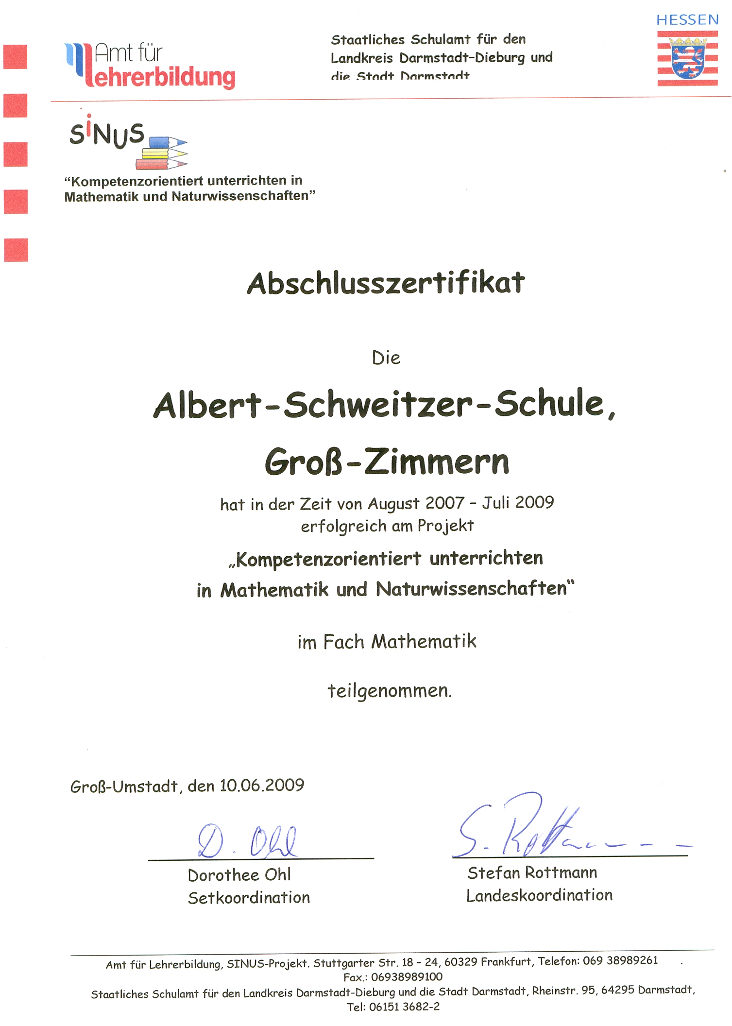 Mit Hilfe vieler Fortbildungsveranstaltungen ist es Ziel des Fachbereichs, Qualitätsverbesserungen im Mathematikunterricht zu erreichen. Mit einer vielfältigen Materialsammlung, die teilweise selbst hergestellte Objekte enthält, ist der Unterricht handlungs- und kompetenzorientiert ausgerichtet.