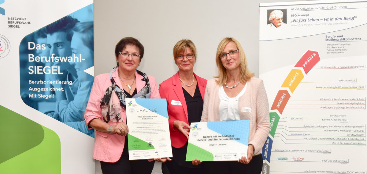 Im Ramen der Rezertifizierung wurde der Albert-Schweitzer-Schule 2015 für weitere drei Jahre das Gütesiegel "Schule mit vorbildlicher Berufs- und Studienorientierung" verliehen.