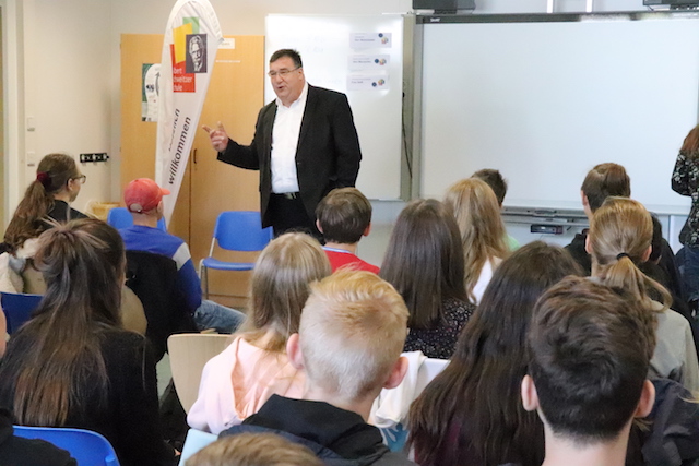 Das Thema Umwelt nimmt der Politik und den Medien derzeit einen sehr breiten Raum ein. Jeder weiß um die Dringlichkeit des Themas, an Schulen zeigt es sich beispielsweise, aber nicht nur, an einer lebenigen Diskussion rund um die Aktivitäten, die als „Fridays for Future“ eine beachtenswerte mediale Präsenz erworben haben. Schülerinnen und Schüler der Jahrgänge neun und zehn hatten heute die Möglichkeit, Herrn Weinmeister, Staatssekretär im Ministerium für die Vertretung der Interessen hessischer Bürgerinnen und Bürger in Berlin und Europa“, dazulegen, was sich die Schülerschaft von der Politik in Sachen Umwelt wünscht und erwartet. Frau Geiß, Vorsitzende des Schulerlternbeirates, hatte im Namen der Schule eingeladen. So zielte die erste Frage an Herrn Weinmeister auf die strittige Frage ab, ob die Teilnahme an der Aktion „Fridays for Future“ denn nun von der Schule sanktioniert werden sollte oder nicht. In der Folge entwickelte sich ein lebhaftes Gespräch, das weit über diesen Aspekt hinausreichte, und in welchem die Schülerinnen und Schüler von der sich bietenden Möglichkeit Gebrauch machten, ihre konkreten Vorstellungen und Erwartungen freiweg direkt an einen Vertreter der Politik zu formulieren.